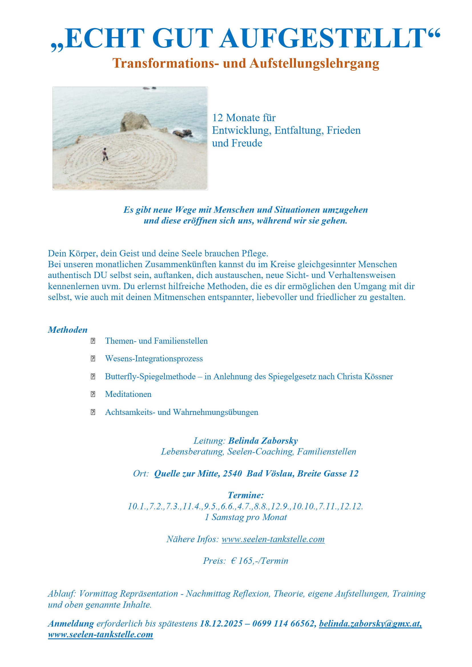Themen- u. Familienaufstellung "Echt gut aufgestellt" 9 Monate für Entwicklung, Entfaltung, Frieden und Freude Themen- u. Familienstellen, Wesens-Integrationsprozess, gewaltfreie Kommunikation, Ehrliches Mitteilen Einsichten aus dem "Kurs in Wundern" uvm |