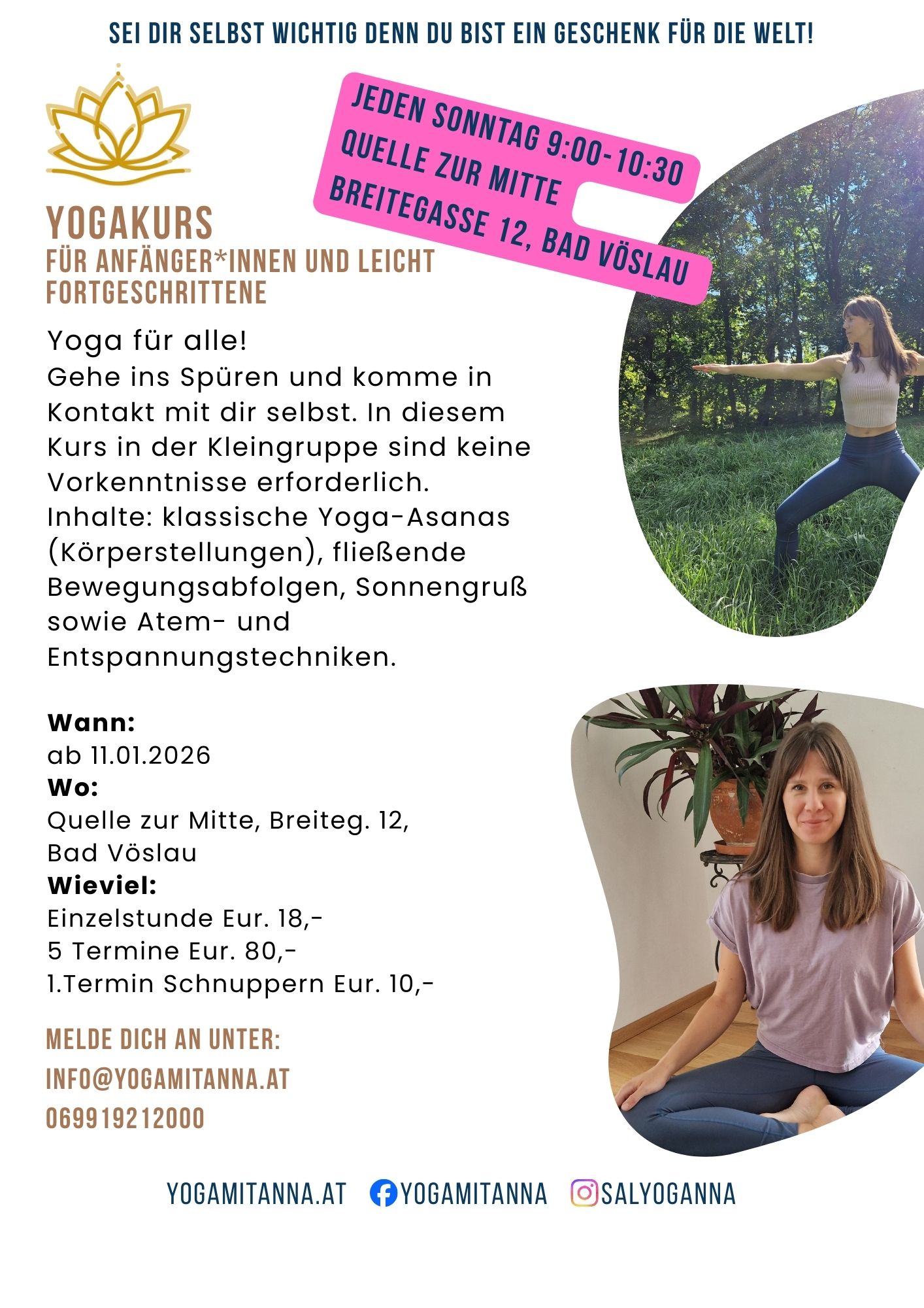 | Mi 11.2. 18.30 - 19.45 | Therapeutisches Yoga Semesterkurs (21 Einheiten, entspricht 18,-/Einheit) |